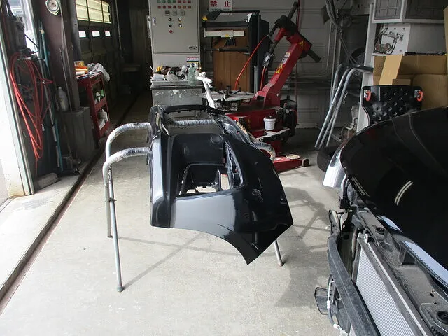フロントバンパー脱着後にキズ・ヘコミをパテ整形していきます。